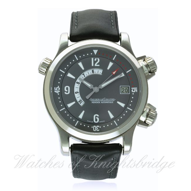 A GENTLEMAN'S 18K WHITE GOLD JAEGER LECOULTRE MASTER COMPRESSOR MEMOVOX ALARM WRIST WATCH CIRCA 2002, REF. 146.3.97 D: Grey dial with luminous markers & Arabic numerals, date & alarm apertures, inner rotating 60 minute bezel. M: Automatic movement signed Jaeger-LeCoultre & numbered. C: Circular case with lockable crowns, signed Jaeger-LeCoultre Memovox, hallmarked & numbered, original crowns, case diameter measures approx. 42mm. S: Black leather strap with original JLC 18k solid white gold deployment clasp. CONDITION REPORT D: Original dial in mint condition. M: Working at present. C: In excellent condition. S: In excellent condition. D: Dial / M: Movement / C: Case / S: Strap / B: Bracelet.