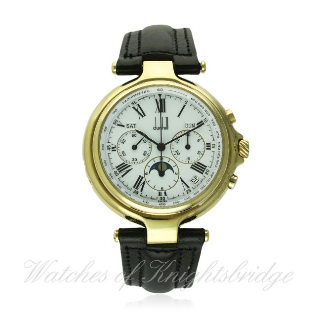 A RARE GENTLEMAN'S 18K SOLID GOLD DUNHILL AUTOMATIC MOON PHASE TRIPLE CALENDAR CHRONOGRAPH WRIST WATCH CIRCA 1990s, WITH ZENITH EL PRIMERO MOVEMENT D: White dial with black Roman numerals, triple register with recording hours, minutes & continuous seconds, day, date & month apertures, moon phase display, tachometer inner bezel. M: 31 jewel automatic movement, signed Dunhill, Zenith El Primero movement calibre 410. C: Circular case with bar lugs, exhibition back, hallmarked & numbered, original crown & pushers, case diameter measures approx. 40mm. S: Original Dunhill leather strap & 18k solid gold pin buckle. CONDITION REPORT D: Original dial in excellent condition. M: Working at present. C: In excellent condition. S: In good condition. D: Dial / M: Movement / C: Case / S: Strap / B: Bracelet