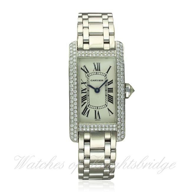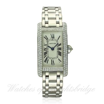 A LADIES 18K SOLID WHITE GOLD CARTIER TANK AMERICAINE BRACELET WATCH CIRCA 2004, REF. 1713 D: Silver dial with Roman numerals & inner minute track, secret signature at VII. M: Quartz movement signed Cartier. C: Curved rectangular case with pave set diamonds, signed Cartier, hallmarked & numbered, diamond set crown, case measures approx. 35mm/19mm. B: Original Cartier 18k solid white gold bracelet. CONDITION REPORT D: Original dial in excellent condition. M: Working at present. C: In excellent condition, crystal has some scratches. B: In excellent condition with some light scratches due to general use. D: Dial / M: Movement / C: Case / S: Strap / B: Bracelet