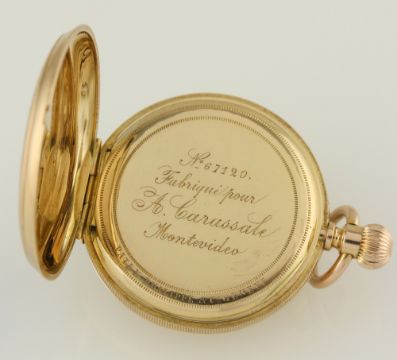 A LADIES 18K SOLID GOLD PATEK PHILIPPE HALF HUNTER POCKET WATCH CIRCA 1910, REF. 67120 MADE FOR A.CARASSALE MONTEVIDEO D: White enamel dial with Roman numerals, outer minute track. M: Swiss keyless wind movement, numbrered. C: Circular engine turned hinged case, with blue enamel Roman numerals, signed P.P & Co, numbered & hallmarked, case diameter approx 35mm excluding the neck & bow. CONDITION REPORT D: Original dial in excellent condition. M: Working at present. C: In good condition, some scratches & wear due to general use. D: Dial / M: Movement / C: Case / S: Strap / B: Bracelet.