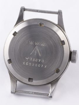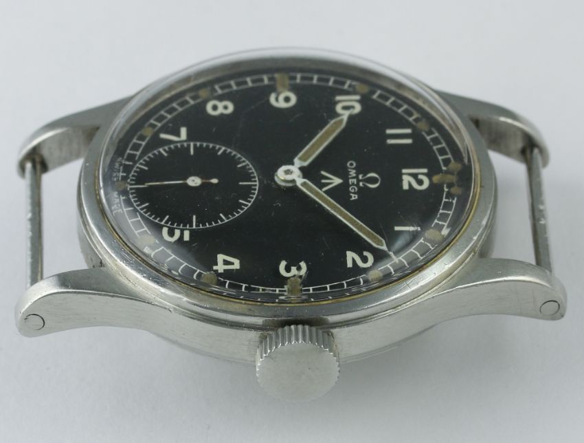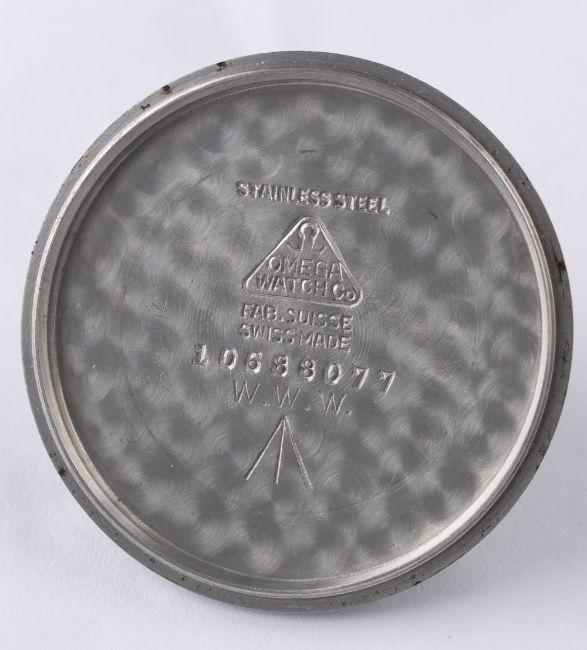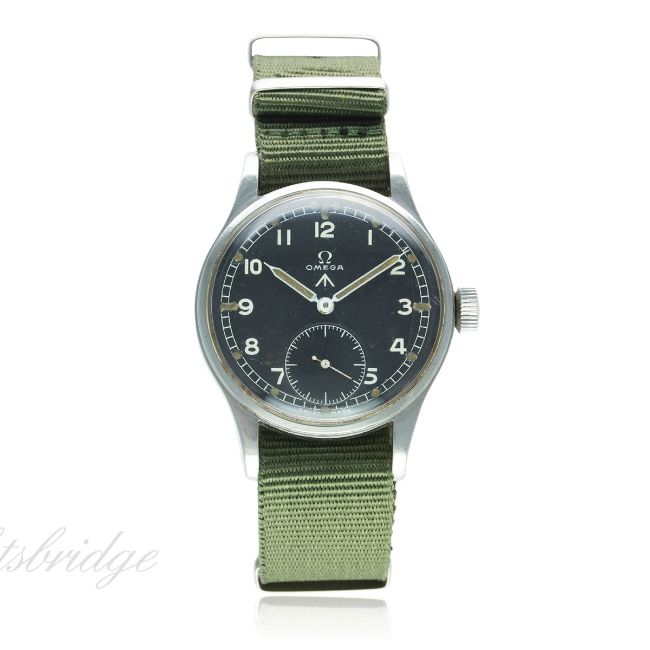 A GENTLEMAN'S STAINLESS STEEL BRITISH MILITARY W.W.W. OMEGA WRIST WATCH CIRCA 1944 D: Black dial with Arabic numerals & luminous markers, subsidiary seconds, military arrow. M: 15 jewel manual wind movement signed Omega & numbered, calibre 30T2. C: Military case with fixed bars, signed Omega Watch Co, issue markings W.W.W.^ Y23878 10688077, case diameter measures approx. 35mm. S: NATO strap. CONDITION REPORT D: Original dial in excellent condition, showing small signs of age. M: Working at present. C: In excellent condition with some light scratches due to use. S: New. D: Dial / M: Movement / C: Case / S: Strap / B: Bracelet