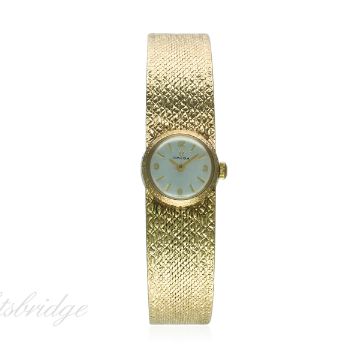 A LADIES 9CT SOLID GOLD OMEGA BRACELET WATCH CIRCA 1968 D: Silver dial with gilt batons & quarterly Arabic numerals. M: 17 jewel manual wind movement, signed Omega Watch Co. & numbered, calibre 484. C: Circular case with engraved bezel, signed Omega Watch Co., hallmarked & numbered, Omega crown, case diameter measures approx. 17mm. B: Original Omega 9ct solid gold integral bracelet, total length measures approx. 180mm. CONDITION REPORT D: Original dial in excellent condition. M: Working at present. C: In excellent condition, with some light scratches due to general use. B: In excellent condition. D: Dial / M: Movement / C: Case / S: Strap / B: Bracelet