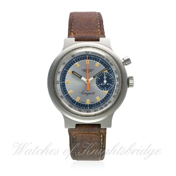 A GENTLEMAN'S STAINLESS STEEL LONGINES CONQUEST SINGLE BUTTON CHRONOGRAPH WRIST WATCH CIRCA 1972 MUNICH OLYMPIC GAMES SPECIAL EDITION D: Silver dial with luminous hour markers, blue chapter ring, outer tachymetre, 30 minute totaliser. M: 17 jewel manual wind movement signed Longines & numbered, Valjoux calibre 236. C: Circular screw back case, signed Longines & numbered, Longines crown, Olympic rings embossed onto caseback, diameter measures approx. 36mm. S: Brown leather strap with Longines pin buckle. CONDITION REPORT D: Original dial in excellent condition. M: Working at present. C: In very good condition. S: Poor. D: Dial / M: Movement / C: Case / S: Strap / B: Bracelet