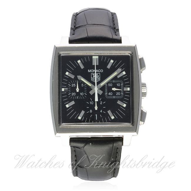 A GENTLEMAN'S STAINLESS STEEL TAG HEUER MONACO AUTOMATIC CHRONOGRAPH WRIST WATCH CIRCA 2005, REF. CW2111-0 D: Black dial with silver batons, minute track with luminous markers, triple register recording hours, minutes & continuous seconds, date aperture at 6 o'clock. M: Automatic movement signed TAG Heuer. C: Classic square Monaco case, signed TAG Heuer Monaco & numbered, original crown & pushers, case width measures approx. 38mm. S: Black leather TAG Heuer strap & deployment clasp. CONDITION REPORT D: Original dial in excellent condition. M: Working at present. C: In excellent condition, with some light scratches due to general use. S: In very good condition. D: Dial / M: Movement / C: Case / S: Strap / B: Bracelet
