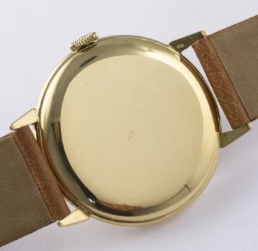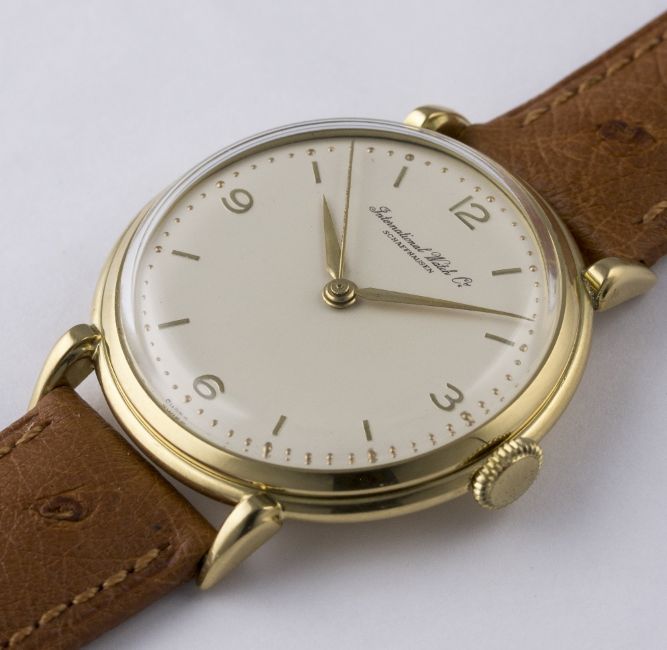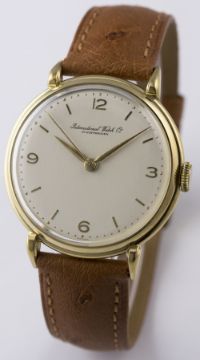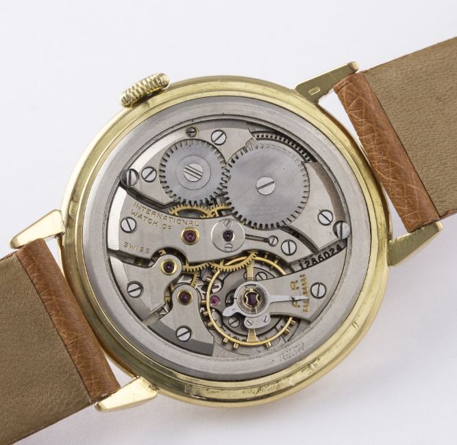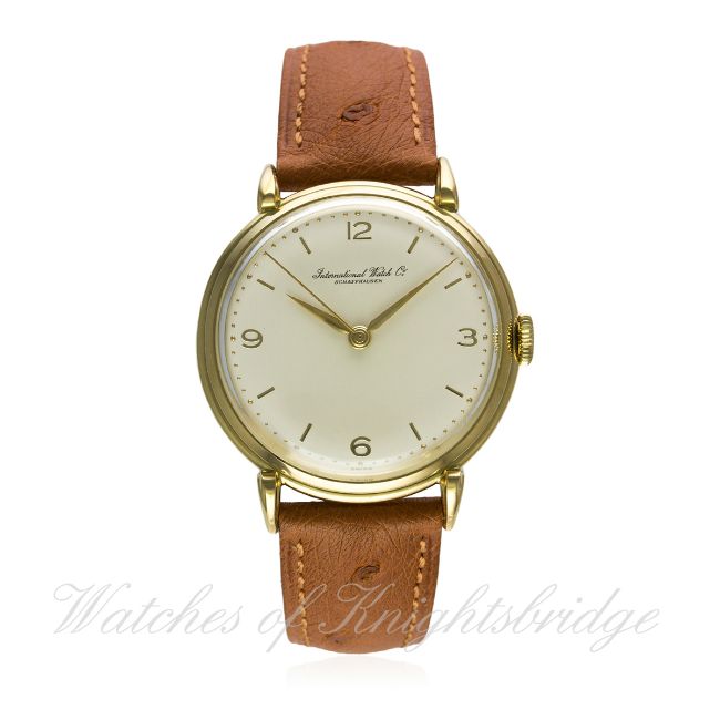 A GENTLEMAN'S LARGE SIZE 18K SOLID GOLD IWC WRIST WATCH CIRCA 1950s D: Silver dial with gilt Arabic numerals & markers, "dagger" hands. M: Manual wind movement, signed International Watch Co. & numbered, calibre C 89. C: Circular case with "claw" lugs, signed IWC, numbered & hallmarked, case diameter measures approx. 37mm. S: Leather strap. CONDITION REPORT D: Dial in excellent condition. M: Working at present. C: In excellent condition, with some light scratches due to general use. S: New. D: Dial / M: Movement / C: Case / S: Strap / B: Bracelet