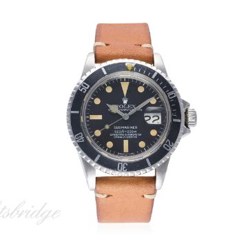 A GENTLEMAN'S STAINLESS STEEL ROLEX OYSTER PERPETUAL DATE SUBMARINER WRIST WATCH CIRCA 1979, REF. 1680 D: Black dial with luminous markers, Mercedes hands, date aperture. M: 26 jewel automatic chronometer movement, signed Montres Rolex S.A. & numbered, calibre 1570. C: Oyster case with 60 minute rotating bezel, signed Montres Rolex S.A., numbered, Rolex crown, case diameter measures approx. 40mm. S: Leather strap. CONDITION REPORT D: Original dial in excellent condition, luminous showing a nice patina. M: Working at present. C: In good condition, with some light scratches & wear due to general use, bezel insert nicely faded. S: In excellent condition. D: Dial / M: Movement / C: Case / S: Strap / B: Bracelet