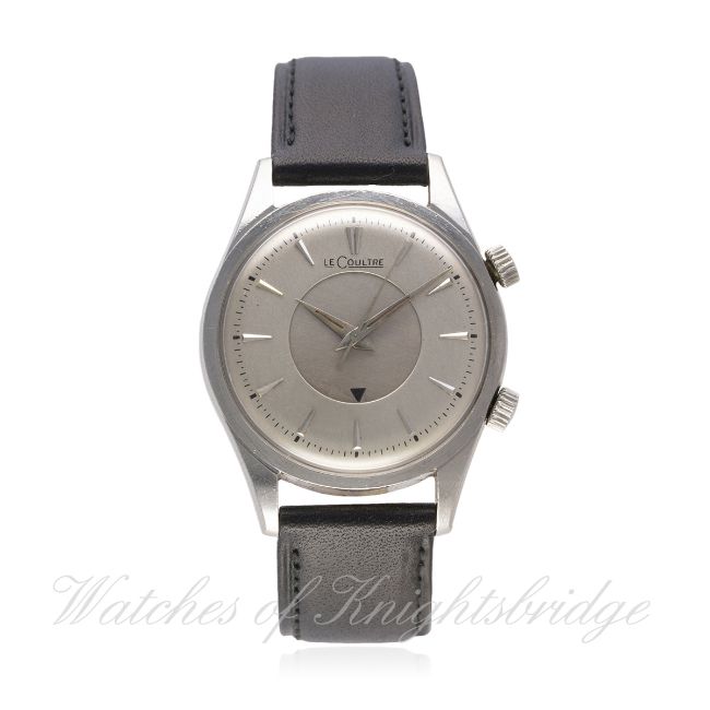A GENTLEMAN'S STAINLESS STEEL LECOULTRE ALARM WRIST WATCH CIRCA 1960s, REF. E856 D: Silver dial with silver "dagger" batons, Dauphine hands, inner rotating dial with arrow pointer to set alarm. M: 17 jewel manual wind movement signed LeCoultre Co. & numbered, calibre K814. C: Circular case, signed LeCoultre, case diameter measures approx. 36mm. S: Leather strap. CONDITION REPORT D: Original dial in excellent condition. M: Working at present. C: In very good condition, with some surface scratches due to general use. S: New. D: Dial / M: Movement / C: Case / S: Strap / B: Bracelet