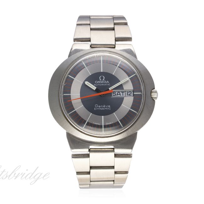 A GENTLEMAN'S STAINLESS STEEL OMEGA DYNAMIC AUTOMATIC BRACELET WATCH CIRCA 1970s D: Grey & silver dial with luminous markers, day date aperture, orange centre seconds hand. M: Automatic movement signed Omega & numbered. C: Oval shaped case, signed Omega Watch Co., Omega crown, case width measures approx 41mm. B: Omega bracelet with replacement inner clasp. CONDITION REPORT D: Original dial in excellent condition. M: Working at present. C: In very good condition, with some light scratches due to general use. B: In good condition. D: Dial / M: Movement / C: Case / S: Strap / B: Bracelet.