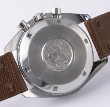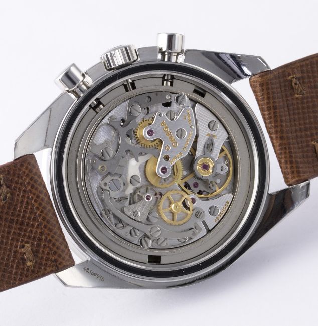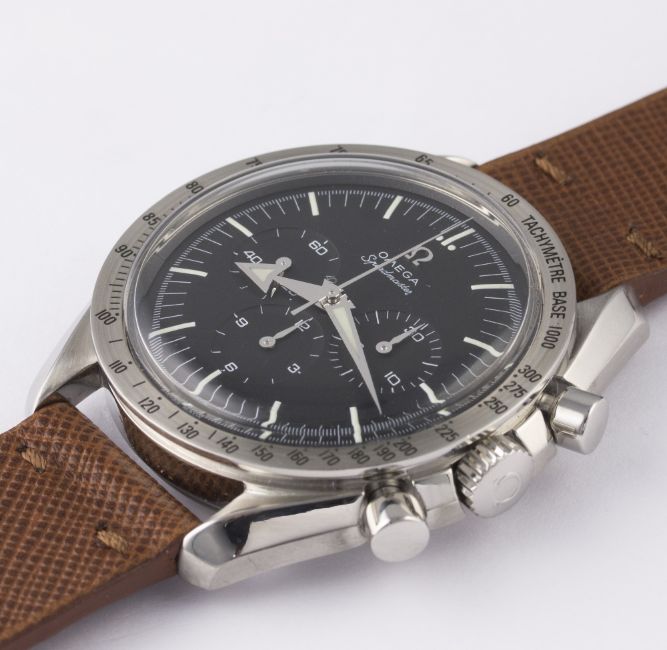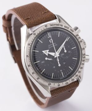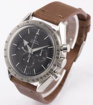 A GENTLEMAN'S STAINLESS STEEL OMEGA SPEEDMASTER PROFESSIONAL BROAD ARROW CHRONOGRAPH WRIST WATCH CIRCA 1998, REF. 145/345.0222 D: Black dial with luminous markers, broad "arrow" hand, triple register recording hours, minutes & continuous seconds. M: 18 jewel manual wind movement, signed Omega & numbered, calibre 1861. C: Circular case with tachymetre bezel, signed Omega Watch Co., Speedmaster emblem embossed on case back, dust cover, Omega crown & pushers, case diameter measures approx. 42mm. S: Brown leather strap. CONDITION REPORT D: Original dial in excellent condition. M: Working at present. C: In excellent condition. S: New D: Dial / M: Movement / C: Case / S: Strap / B: Bracelet.