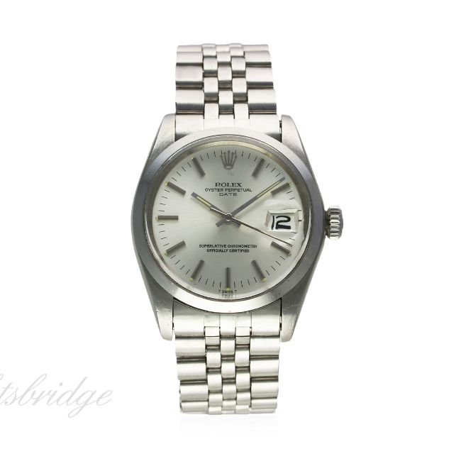 A GENTLEMAN'S STAINLESS STEEL ROLEX OYSTER PERPETUAL DATE BRACELET WATCH CIRCA 1973, REF. 1500 D: Silver dial with silver batons, date aperture. M: 26 jewel automatic chronometer movement, signed Montres Rolex S.A. & numbered, calibre 1570. C: Oyster case with "smooth" bezel, signed Montres Rolex S.A., numbered, Rolex crown, case diameter measures approx. 35mm B: Rolex Jubilee bracelet, signed Rolex U.S.A.. CONDITION REPORT D: Original dial in excellent condition. M: Working at present. C: In excellent condition, with some light scratches due to general use. B: In very good condition. D: Dial / M: Movement / C: Case / S: Strap / B: Bracelet