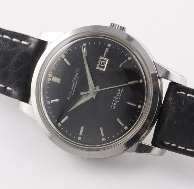 A RARE GENTLEMAN'S STAINLESS STEEL IWC INGENIEUR WRIST WATCH CIRCA 1950s WITH IWC BOX D: Gloss black dial with silver batons & luminous markers, dauphine hands. M: 21 jewel automatic movement, signed International Watch Co. & numbered, calibre 8521. C: Circular anti-magnetic case with dust cover, signed International Watch Co., numbered, case diameter measures approx. 36mm. S: Leather strap. CONDITION REPORT D: Original dial in excellent condition. M: Working at present. C: In excellent condition, with some light scratches due to general use. S: New. D: Dial / M: Movement / C: Case / S: Strap / B: Bracelet