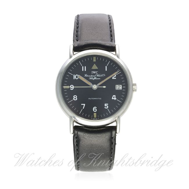 A GENTLEMAN'S STAINLESS STEEL IWC PORTOFINO AUTOMATIC WRIST WATCH CIRCA 1990s, REF. 3513 D: Black military style dial with Arabic numerals & luminous markers & hands, date aperture. M: Automatic movement signed International Watch Co. C: Circular case, signed International Watch Co & numbered, IWC crown, case diameter measures approx. 34mm. S: Black leather strap with IWC pin buckle. CONDITION REPORT D: Original dial in excellent condition, luminous showing a patina. M: Working at present. C: In very good condition. S: In very good condition. D: Dial / M: Movement / C: Case / S: Strap / B: Bracelet