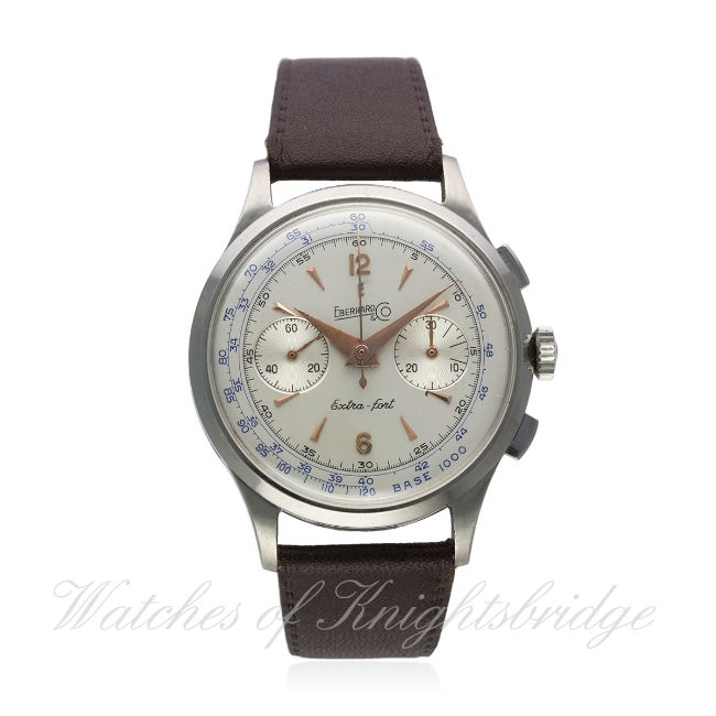 A RARE GENTLEMAN'S STAINLESS STEEL EBERHARD & CO EXTRA FORT CHRONOGRAPH WRIST WATCH CIRCA 1950s, REF. 14003/47 D: Silver dial with gilt "dagger" batons & dauphine hands, double register recording minutes & continuous seconds. M: Manual wind movement, signed Eberhard & Co. C: Large circular case, bottom "pusher" slides to lock the chronograph, signed Eberhard & Co, numbered, original crown pushers, case diameter measures approx. 38mm. S: Leather strap. CONDITION REPORT D: Original dial in excellent condition. M: Working at present. C: In excellent condition. S: In excellent condition. D: Dial / M: Movement / C: Case / S: Strap / B: Bracelet