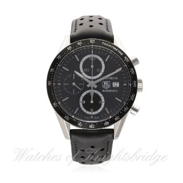 A GENTLEMAN'S STAINLESS STEEL TAG HEUER CARRERA AUTOMATIC CHRONOGRAPH WRIST WATCH DATED 2014, REF. CV2010-4 JUAN MANUEL FANGIO SPECIAL EDITION WITH BOX & PAPERS D: Black dial with silver batons, triple register recording hours, minutes & continuous seconds, date aperture. M: Automatic movement signed TAG Heuer. C: Circular case with tachymetre bezel, portrait of Juan Manuel Fangio embossed onto case back, signed Carrera & numbered, original crown & pushers, case diameter measures approx. 42mm. S: Original TAG Heuer perforated leather strap & deployment clasp. CONDITION REPORT D: Original dial in mint condition. M: Working at present. C: In excellent condition. S: In excellent condition. D: Dial / M: Movement / C: Case / S: Strap / B: Bracelet