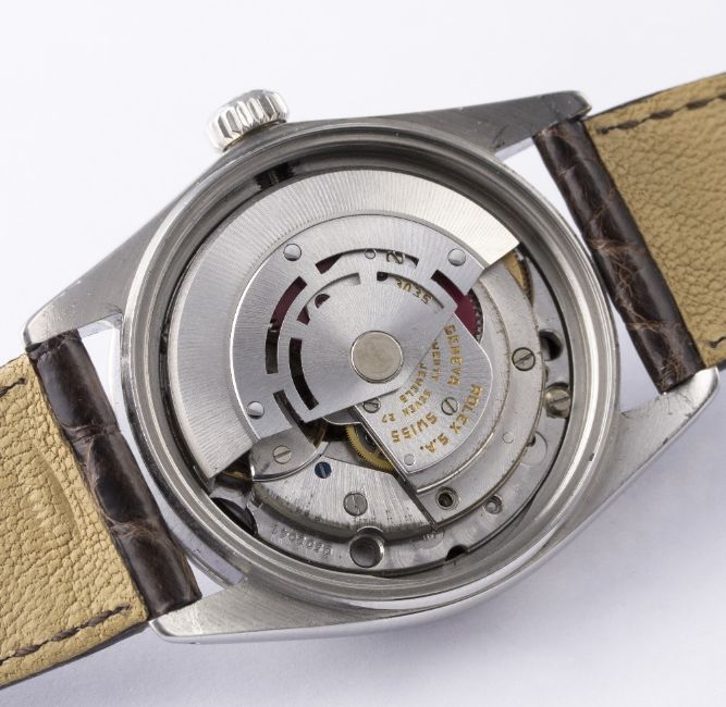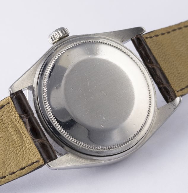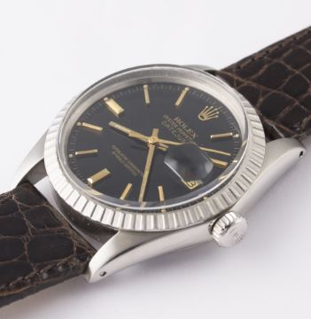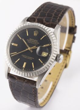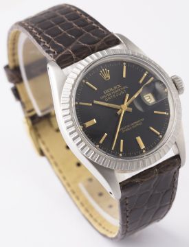 A GENTLEMAN'S STAINLESS STEEL ROLEX OYSTER PERPETUAL DATEJUST BRACELET WATCH CIRCA 1979, REF. 16030 D: Charcoal colour dial with gilt batons & hands, gilt tracking & font, date aperture. M: 27 jewel automatic chronometer movement with quick-set date, signed Rolex S.A. & numbered, calibre 3035. C: Oyster case with milled bezel, signed Montres Rolex S.A., numbered, Rolex crown, case diameter measures approx. 36mm. S: Brown leather strap. CONDITION REPORT D: Original dial in excellent condition, with some very small signs of age. M: Working at present. C: In excellent condition, with some light scratches due to general use. S: New. D: Dial / M: Movement / C: Case / S: Strap / B: Bracelet
