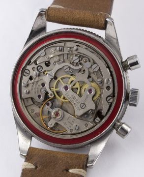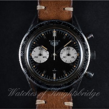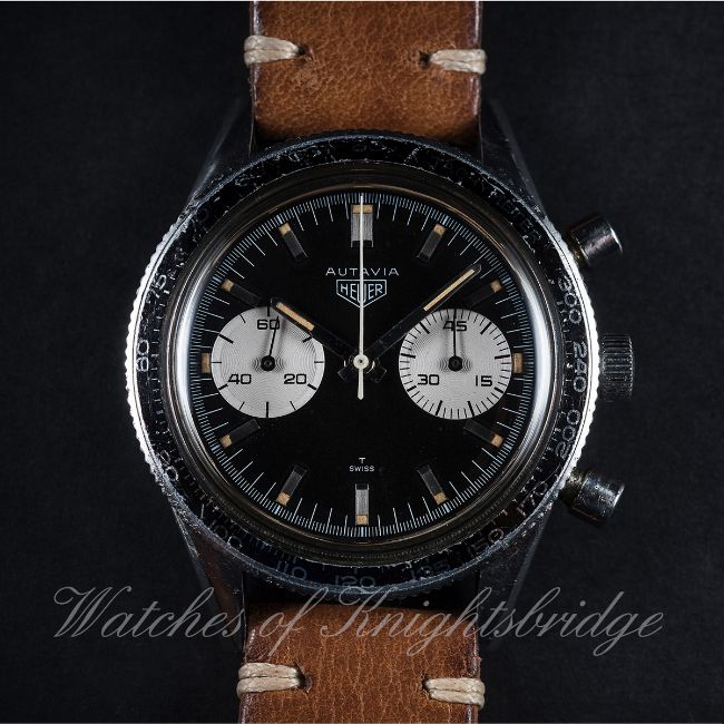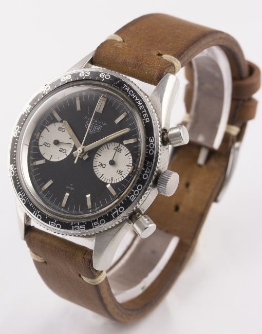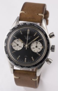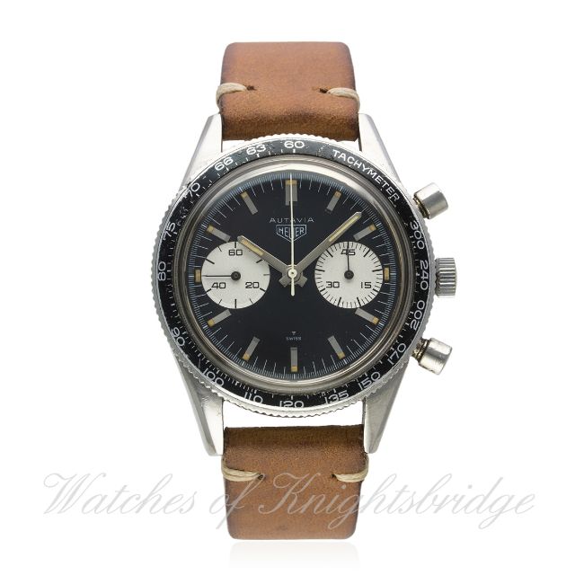 A RARE GENTLEMAN'S STAINLESS STEEL HEUER AUTAVIA CHRONOGRAPH WRIST WATCH CIRCA 1960s, REF. 3646 "ANDRETTI" D: Black dial with part luminous silver batons & hands, two silver registers recording minutes & continuous seconds. M: 17 jewel manual wind movement signed Heuer Leonidas SA, Valjoux calibre 92. C: Circular case with tachymetre bezel, signed Heuer Autavia, numbered, case back inscription P. Zehnder, Basel 17.1.54, case diameter measures approx. 39mm. S: Brown leather strap. CONDITION REPORT D: Original dial in excellent condition. M: Working at present. C: In very good original condition, with some light scratches due to general use. S: In excellent condition. D: Dial / M: Movement / C: Case / S: Strap / B: Bracelet
