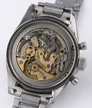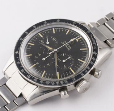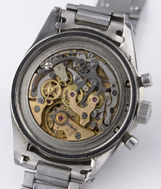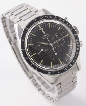 A RARE GENTLEMAN'S STAINLESS STEEL OMEGA SPEEDMASTER CHRONOGRAPH BRACELET WATCH CIRCA 1962, REF. 2998-62 D: Black dial with luminous markers, triple register recording hours, minutes & continuous seconds, steel "alpha" minute & hour hands. M: 17 jewel manual wind movement, signed Omega Watch Co. & numbered, calibre 321. C: Circular case with tachymetre bezel, signed Omega Watch Co., Speedmaster emblem on case back, dust cover, Omega crown & pushers, case diameter measures approx. 40mm. B: Original Omega flat-link bracelet, numbered 7912 & dated 3/62. CONDITION REPORT D: Original dial in excellent condition. M: Working at present. C: In excellent condition with some light wear due to general use. B: In very good condition. D: Dial / M: Movement / C: Case / S: Strap / B: Bracelet