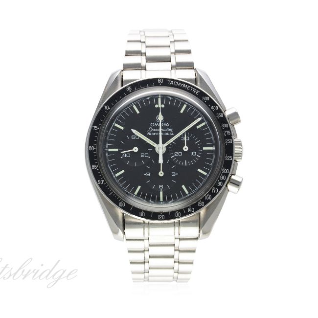 A GENTLEMAN'S STAINLESS STEEL OMEGA SPEEDMASTER PROFESSIONAL CHRONOGRAPH BRACELET WATCH CIRCA 1984, REF. ST 145.022 D: Black dial with luminous markers, triple register recording hours, minutes & continuous seconds. M: 17 jewel manual wind movement, signed Omega & numbered, calibre 861. C: Circular case with tachymetre bezel, signed Omega Watch Co., Speedmaster emblem embossed on case back with NASA Moon landing tribute, dust cover, Omega crown & pushers, case diameter measures approx. 42mm. B: Original Omega Speedmaster bracelet numbered (32) 1479/812. CONDITION REPORT D: Original dial in excellent condition. M: Working at present. C: In excellent condition. B: In excellent condition with some light surface scratches. D: Dial / M: Movement / C: Case / S: Strap / B: Bracelet.