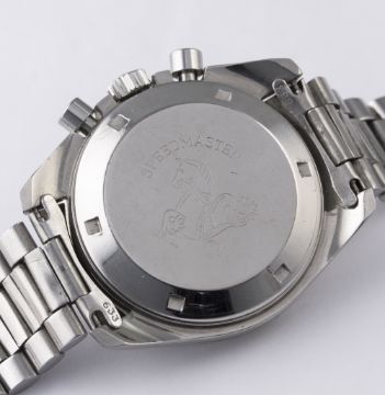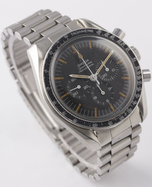 A RARE GENTLEMAN'S STAINLESS STEEL OMEGA SPEEDMASTER PROFESSIONAL CHRONOGRAPH BRACELET WATCH CIRCA 1967, REF. 145.012-67 "PRE MOON" D: Black dial with luminous markers, triple register recording hours, minutes & continuous seconds. M: 17 jewel manual wind movement, signed Omega Watch Co. & numbered, calibre 321. C: Circular case with tachymetre bezel, signed Omega Watch Co., Speedmaster emblem on case back, dust cover, Omega crown & pushers, case diameter measures approx. 42mm. B: Omega bracelet, numbered (11) 1171/633. CONDITION REPORT D: Original dial in excellent condition. M: Working at present. C: In excellent condition with some light scratches & wear due to general use. B: In very good condition. D: Dial / M: Movement / C: Case / S: Strap / B: Bracelet