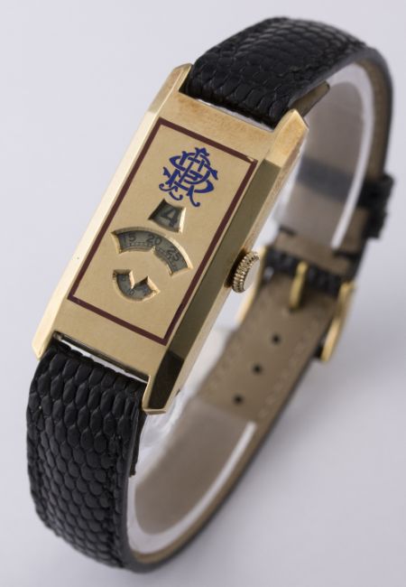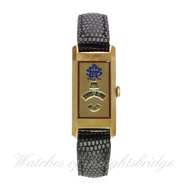 A GENTLEMAN'S 18K SOLID GOLD JUMP HOUR WRIST WATCH CIRCA 1920s D: Seconds, minutes & hour apertures. M: Swiss manual wind movement. C: 18k solid gold rectangular hinged case, enameled initials, signed JW, hallmarked & numbered, case length & width measures approx. 40mm/19mm. S: Black leather strap. CONDITION REPORT M: Not working at present. C: In very good condition. S: In very good condition. D: Dial / M: Movement / C: Case / S: Strap / B: Bracelet