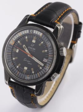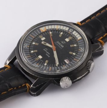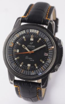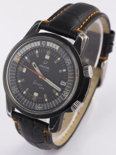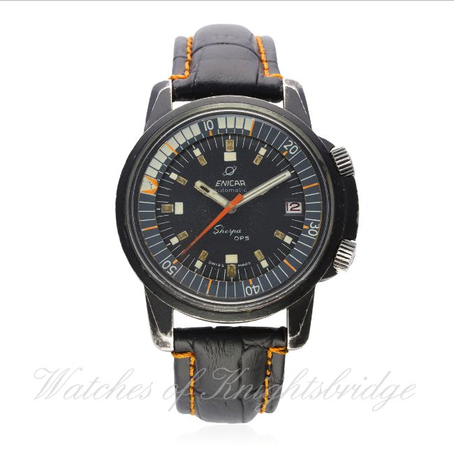 A RARE GENTLEMAN'S PVD COATED ENICAR SHERPA OPS DIVERS WRIST WATCH CIRCA 1960s, REF. 144/35/03A D: Black dial with luminous markers, date aperture, inner rotating 60 minute bezel. M: Automatic movement signed Enicar. C: Compressor type case with crown guard, Sherpa 600 emblem embossed on case back, signed Enicar & numbered, Enicar crowns, case diameter measures approx. 41mm, excluding crown guard. S: Leather strap. CONDITION REPORT D: Original dial in excellent condition, showing some small signs of age. M: Working at present. C: In good condition, with some light scratches & wear to the PVD coating. S: New. D: Dial / M: Movement / C: Case / S: Strap / B: Bracelet