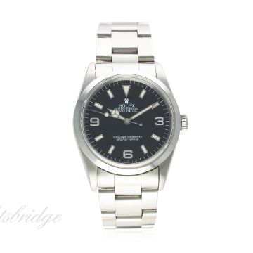 A GENTLEMAN'S STAINLESS STEEL ROLEX OYSTER PERPETUAL EXPLORER BRACELET WATCH CIRCA 1996, REF. 14270 D: Gloss black dial with luminous inlaid silver markers & 3-6-9 Arabic numerals, Mercedes hands. M: Automatic chronometer movement, signed Rolex & numbered. C: Oyster case with sapphire crystal, signed Montres Rolex S.A., T serial no., Rolex crown, case diameter measures approx. 36mm. B: Rolex Oyster bracelet with flip lock clasp, numbered X9/93150/558B. CONDITION REPORT D: Original dial in very good condition, showing some unusual signs of age. M: Working at present. C: In excellent condition, with original stock sticker. B: In very good condition with some light scratches due to general use. D: Dial / M: Movement / C: Case / S: Strap / B: Bracelet