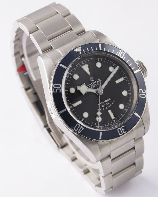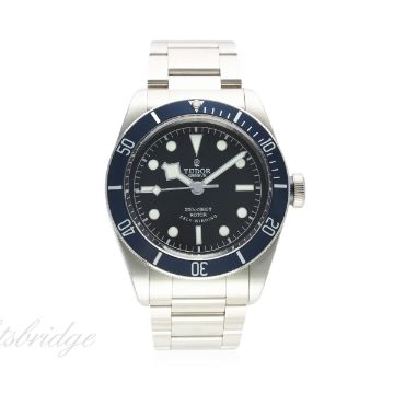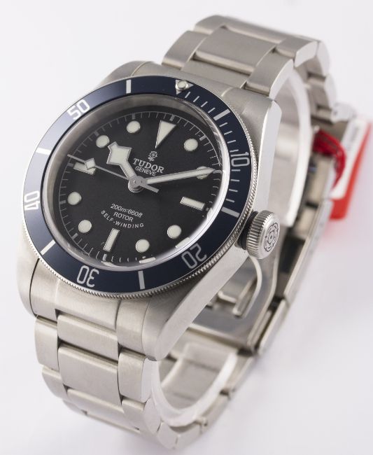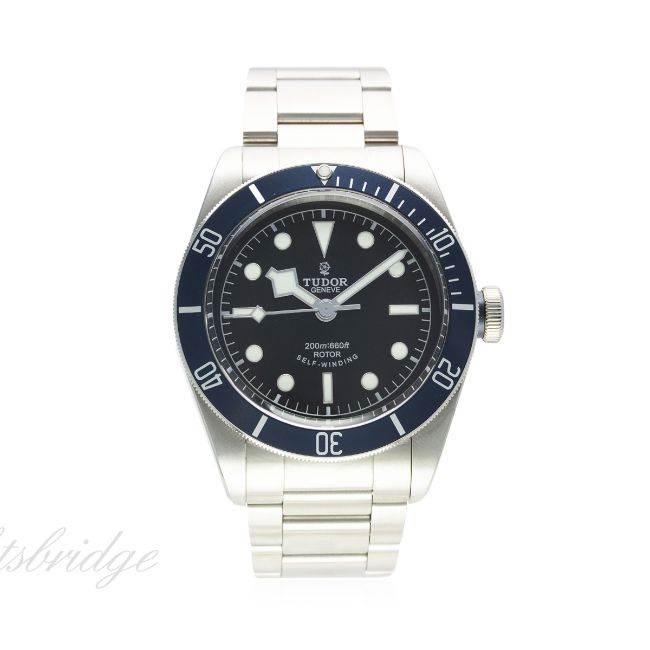 A GENTLEMAN'S STAINLESS STEEL ROLEX TUDOR BLACK BAY DIVERS BRACELET WATCH CIRCA 2014, REF. 79220B, WITH BOX, PAPERS & ADDITIONAL STRAP, UNWORN & STILL UNDER MANUFACTURERS WARRANTY D: Matt black dial with luminous markers, silver font & chapter ring, "snowflake" hands. M: Automatic movement, signed Tudor. C: Circular case with blue 60 minute rotating bezel, signed Tudor Geneve, numbered, original screw down crown, case diameter measures approx. 41mm. B: Original Tudor Black Bay bracelet. CONDITION REPORT D: Original dial in mint condition. M: Working at present. C: In mint condition, with original stickers & tags attached. S: In mint condition, with original protective stickers, additional strap unworn. D: Dial / M: Movement / C: Case / B: Bracelet / S: Strap