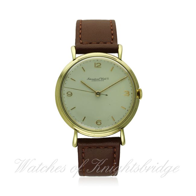 A GENTLEMAN'S 18K SOLID GOLD IWC WRIST WATCH CIRCA 1950s D: Silver dial with gilt Arabic numerals & markers. M: Manual wind movement, signed International Watch Co. & numbered, calibre C 89. C: Circular case with "claw" lugs, signed IWC, numbered & hallmarked, case diameter measures approx. 36mm. S: Brown leather strap. CONDITION REPORT D: Dial in excellent condition. M: Working at present. C: In excellent condition, with some very light scratches due to general use. S: New. D: Dial / M: Movement / C: Case / S: Strap / B: Bracelet