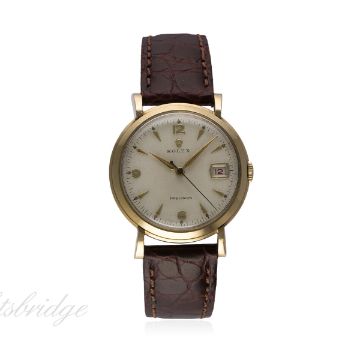A GENTLEMAN'S 9CT SOLID GOLD ROLEX PRECISION DATE WRIST WATCH DATED 1955 FROM CASE BACK INSCRIPTION D: Silver dial with raised gilt Arabic numerals, "dagger" batons & hands, date aperture. M: 17 jewel manual wind movement, signed Montres Rolex S.A. & numbered. C: Circular case, signed D.S.&S., hallmarked & numbered, case diameter measures approx. 34mm. S: Leather strap. CONDITION REPORT D: Dial in very good condition. M: Working at present. C: In excellent condition, with some light scratches due to general use. S: In very good condition. D: Dial / M: Movement / C: Case / S: Strap / B: Bracelet.