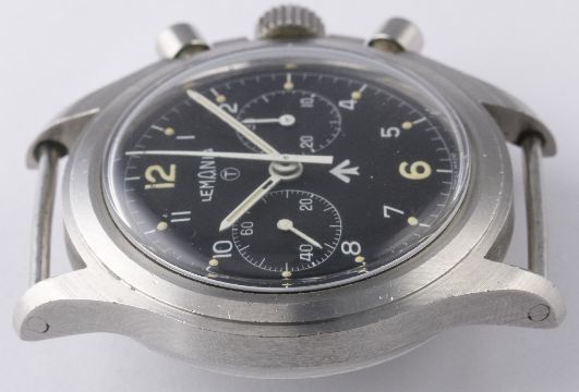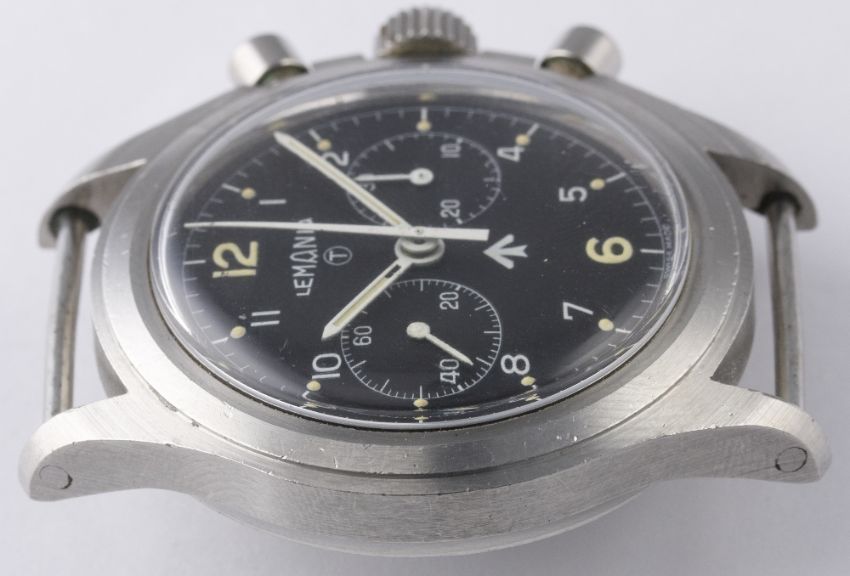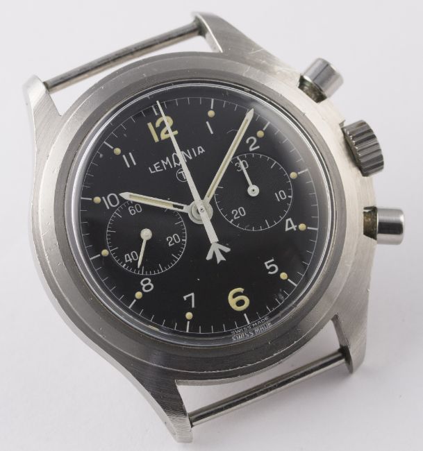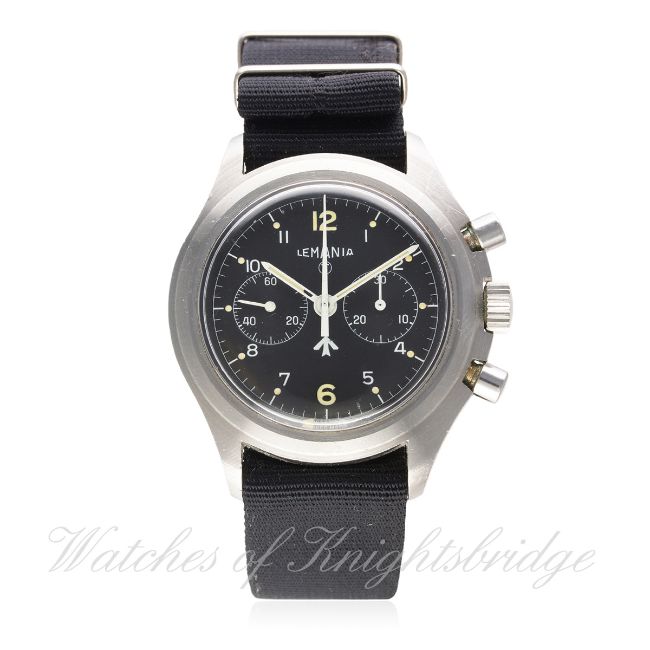 A RARE GENTLEMAN'S STAINLESS STEEL BRITISH MILITARY ROYAL NAVY LEMANIA PILOTS CHRONOGRAPH WRIST WATCH DATED 1976 D: Black dial with Arabic numerals & tritium luminous markers, military arrow, double register recording minutes & continuous seconds. M: 17 jewel manual wind movement, signed Lemania Watch Co. & numbered, calibre 1872. C: Asymmetric military case with fixed bars, issue markings ^ 0552/924-3306 5288/76, case diameter measures approx. 40mm. S: NATO strap. CONDITION REPORT D: Original dial in excellent condition. M: Working at present. C: In excellent unpolished condition some light scratches due to use. S: New. D: Dial / M: Movement / C: Case / S: Strap / B: Bracelet.