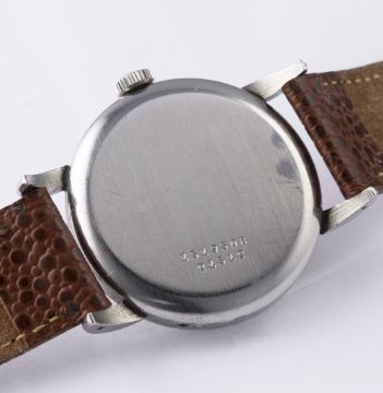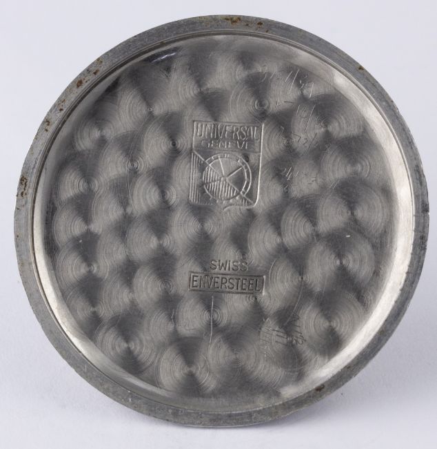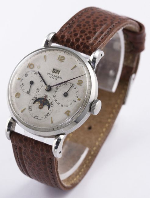 A RARE GENTLEMAN'S STAINLESS STEEL UNIVERSAL GENEVE MOONPHASE TRIPLE CALENDAR WRIST WATCH CIRCA 1940s, REF. 21312 D: Silver dial with raised gilt Arabic numerals & "dagger" batons, day aperture, three sub-dials for date, month with moonphase aperture and continuous seconds. M: Manual wind movement, signed Universal Geneve, calibre 291. C: Circular case with "claw" lugs, signed Universal Geneve & numbered, case diameter measures approx. 35mm. S: Brown leather strap. CONDITION REPORT D: Dial in good condition showing signs of age. M: Working at present. C: In excellent condition with some surface scratches due to general use. S: In very good condition. D: Dial / M: Movement / C: Case / S: Strap / B: Bracelet