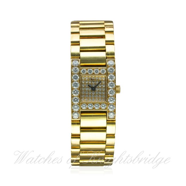 A LADIES 18K SOLID GOLD & DIAMOND CHOPARD "H" BRACELET WATCH CIRCA 2000, REF. 493 1 D: Pave set diamond dial. M: Quartz movement signed Chopard. C: "H" shape case with original diamond set bezel & lugs, signed Chopard, hallmarked & numbered, original crown, case width measures approx. 19mm. B: Original 18k gold Chopard bracelet. CONDITION REPORT D: Original dial in excellent condition. M: Working at present. C: In excellent condition, with some light scratches due to general use. B: In excellent condition with some light scratches due to general use. D: Dial / M: Movement / C: Case / S: Strap / B: Bracelet