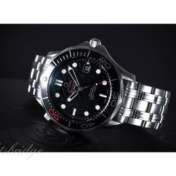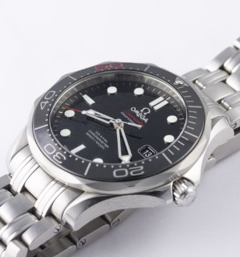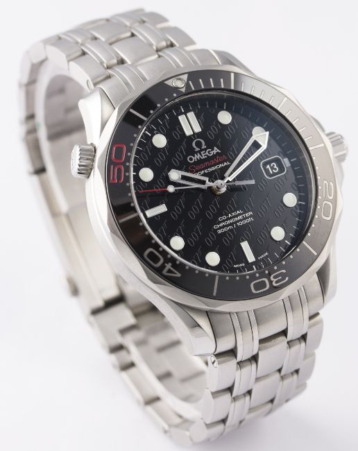 A GENTLEMAN'S STAINLESS STEEL OMEGA SEAMASTER PROFESSIONAL 300M BRACELET WATCH DATED 2012, 50 YEAR JAMES BOND LIMITED EDITION OF 11007 PIECES WITH ORIGINAL BOX, PAPERS & CERTIFICATE OF AUTHENTICITY D: Black 007 monogram dial with luminous inlaid silver markers, date aperture. M: Automatic co-axial chronometer movement signed Omega & numbered, calibre 2507. C: Circular case with 60 minute Liquidmetal rotating bezel, helium escape valve, partial exhibition case back with gun-barrel design displaying a bullet decoration on rotor, limited edition number, original crowns, case diameter approx. 41mm. B: Original Omega bracelet. CONDITION REPORT D: Original dial in mint condition. M: Working at present. C: In excellent condition. B: In excellent condition, with some light scratches due to occasional use. D: Dial / M: Movement / C: Case / B: Bracelet / S: Strap