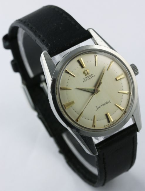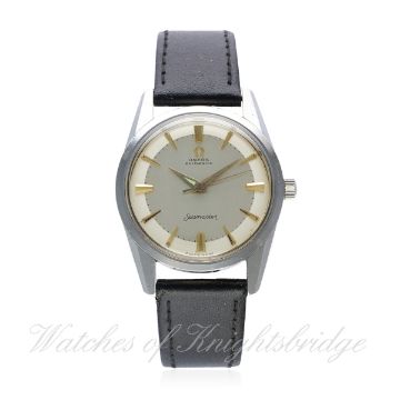 A GENTLEMAN'S STAINLESS STEEL OMEGA SEAMASTER AUTOMATIC WRIST WATCH CIRCA 1960, REF. 14700 1 SC D: Two tone silver dial with gilt "dagger" batons & dauphine hands. M: 24 jewel automatic movement, signed Omega Watch Co. & numbered, calibre 552. C: Circular screw back case, signed Omega Watch Co., Seamaster emblem embossed on case back, Omega crown, case diameter measures approx. 34mm. S: Black leather strap. CONDITION REPORT D: Original dial in excellent condition. M: Working at present. C: In excellent condition, with some light scratches due to general use. S: In fair condition. D: Dial / M: Movement / C: Case / S: Strap / B: Bracelet