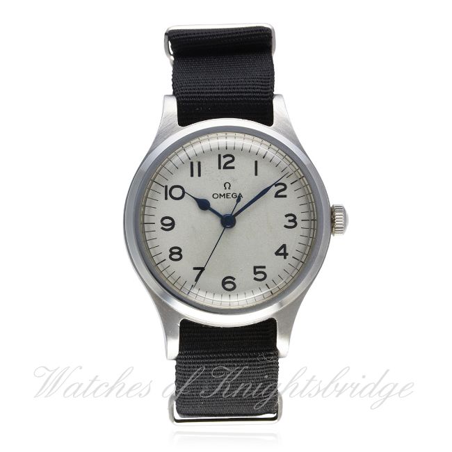 A GENTLEMAN'S STAINLESS STEEL BRITISH MILITARY RAF OMEGA PILOTS WRIST WATCH DATED 1956 D: Silver dial with Arabic numerals. M: 16 jewel manual wind movement signed Omega & numbered, calibre 30T2SC. C: Military case with fixed bars, issue markings A.M. 6B/159 4825/56, inner ring, Omega crown, case diameter measures approx. 36mm. S: NATO strap. CONDITION REPORT D: M.O.D dial in excellent condition. M: Working at present. C: In excellent condition. S: New. D: Dial / M: Movement / C: Case / S: Strap / B: Bracelet