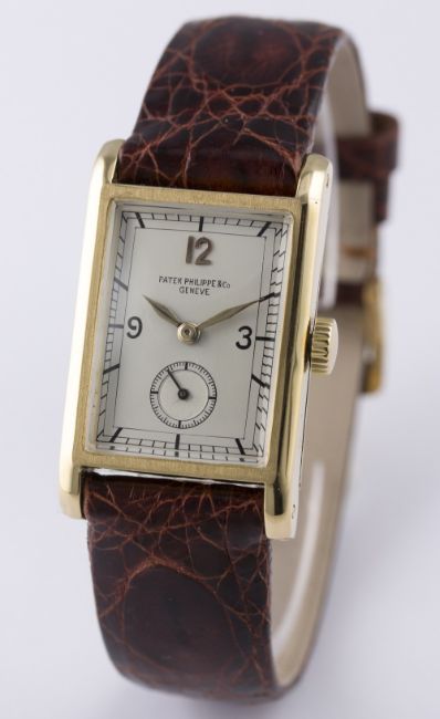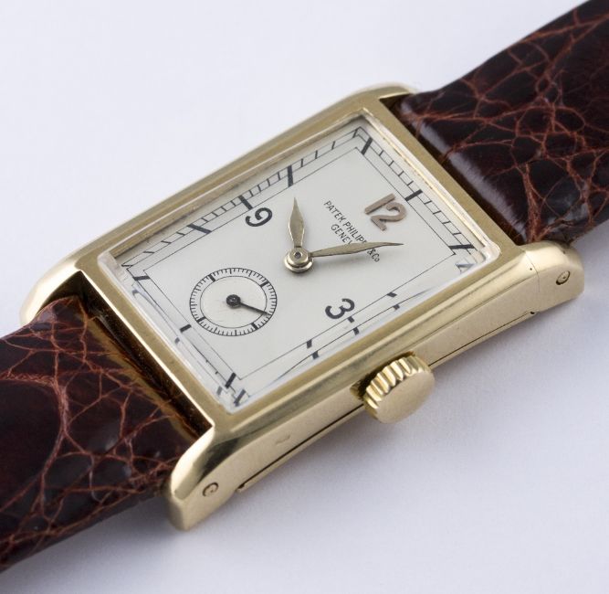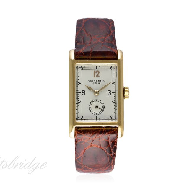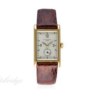 A GENTLEMAN'S 18K SOLID GOLD PATEK PHILIPPE RECTANGULAR WRIST WATCH CIRCA 1940s D: Silver dial with quarterly Arabic numerals, outer hour & minute tracking, subsidiary seconds. M: Manual wind movement, signed Patek Philippe & Cie, numbered. C: Rectangular case, signed Patek Philippe & Co., hallmarked & numbered, case measures approx. 38mm by 23mm. S: Brown leather strap. CONDITION REPORT D: Dial in excellent condition. M: Working at present. C: In excellent condition. S: New. D: Dial / M: Movement / C: Case / S: Strap / B: Bracelet.