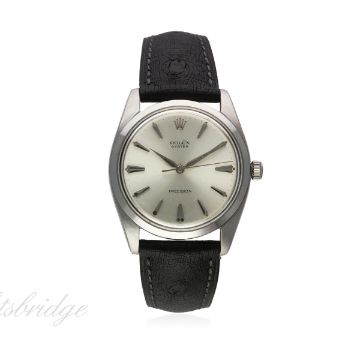 A RARE GENTLEMAN'S LARGE SIZE STAINLESS STEEL ROLEX OYSTER PRECISION WRIST WATCH CIRCA 1954, REF. 6424 D: Silver dial with "dagger" batons & hands. M: 17 jewel manual wind movement, signed Montres Rolex S.A. & numbered, calibre 1215. C: Oyster case, signed Montres Rolex S.A., numbered, Rolex crown, case diameter measures approx. 36mm. S: Black leather strap. CONDITION REPORT D: Original dial in excellent condition. M: Working at present. C: In excellent condition, with some light scratches due to general use. S: New. D: Dial / M: Movement / C: Case / S: Strap / B: Bracelet
