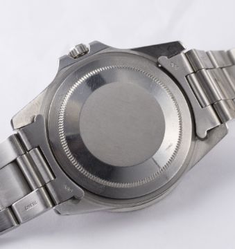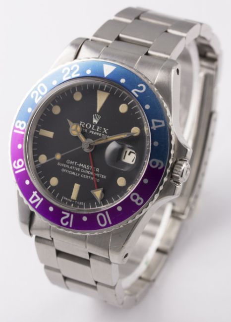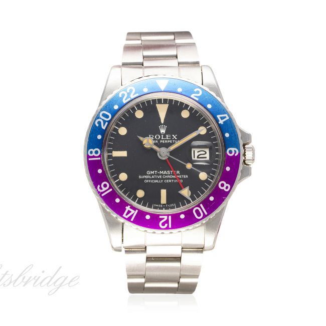 A GENTLEMAN'S STAINLESS STEEL ROLEX OYSTER PERPETUAL DATE GMT MASTER BRACELET WATCH CIRCA 1968, REF. 1675 "PINK PANTHER" D: Matt black dial with luminous markers, Mercedes hands, dual time zone arrow hand, date aperture. M: 26 jewel automatic chronometer movement, signed Montres Rolex S.A. & numbered, calibre 1570. C: Oyster case with 24 hour rotating "Pepsi" bezel, signed Montres Rolex S.A., dated I.68, numbered, Rolex crown, case diameter measures approx. 40mm. B: Rolex "heavy" Oyster bracelet, numbered VC/78360/580. CONDITION REPORT D: Original dial in excellent condition. M: Working at present. C: In excellent condition, with some light scratches due to general use, bezel insert nicely faded. B: In excellent condition, with some light surface scratches. D: Dial / M: Movement / C: Case / S: Strap / B: Bracelet