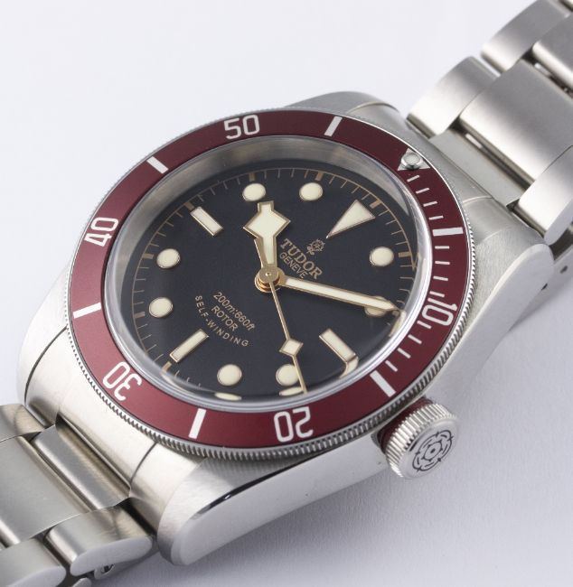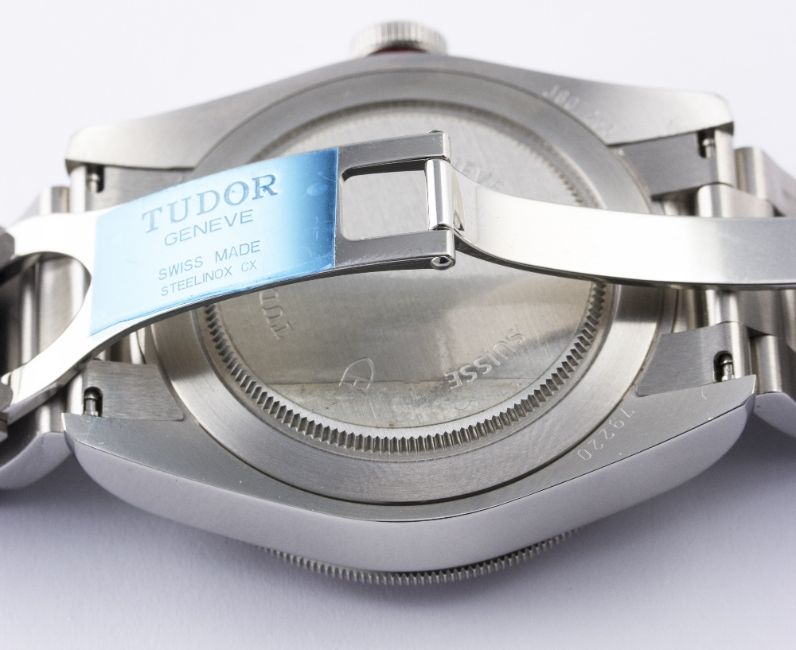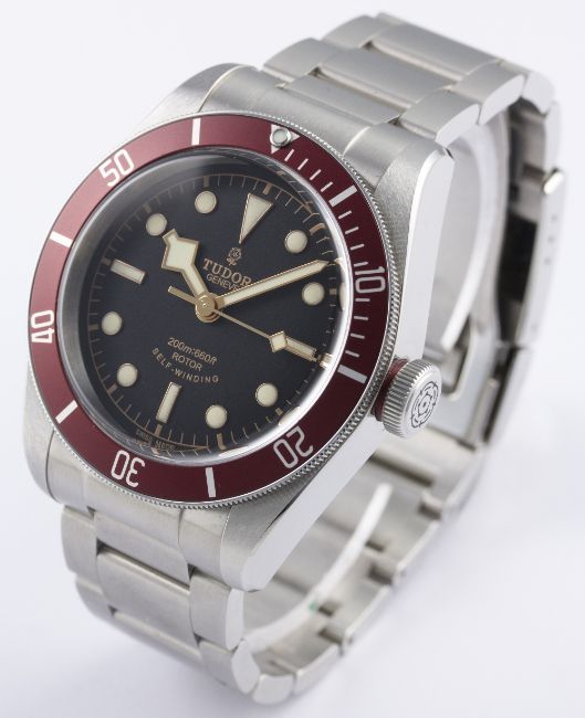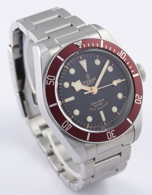 A GENTLEMAN'S STAINLESS STEEL ROLEX TUDOR BLACK BAY DIVERS BRACELET WATCH CIRCA 2013, REF. 79220R, WITH BOX, PAPERS, TAGS & ADDITIONAL STRAP D: Matt black dial with luminous filled gilt markers, gilt font & chapter ring, "snowflake" hands. M: Automatic movement, signed Tudor. C: Circular case with red 60 minute rotating bezel, signed Tudor Geneve, numbered, original screw down crown, case diameter measures approx. 41mm. B: Original Tudor Black Bay bracelet. CONDITION REPORT D: Original dial in mint condition. M: Working at present. C: In mint condition S: In mint condition still with blue stick on clasp. D: Dial / M: Movement / C: Case / B: Bracelet / S: Strap
