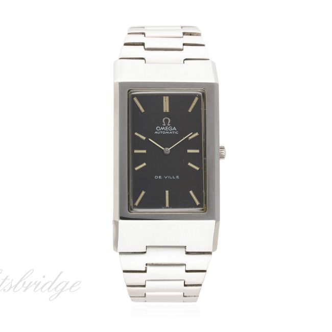 A GENTLEMAN'S STAINLESS STEEL RECTANGULAR OMEGA DE VILLE AUTOMATIC BRACELET WATCH CIRCA 1970s D: Grey dial with inlaid silver batons. M: Automatic movement signed Omega & numbered. C: Rectangular shaped case, signed Omega Watch Co., Omega crown, De Ville emblem embossed, case measures approx 50mm by 27mm. B: Original Omega bracelet, numbered (11) 1217 / 207. CONDITION REPORT D: Original dial in excellent condition. M: Working at present. C: In excellent condition. B: In excellent condition. D: Dial / M: Movement / C: Case / S: Strap / B: Bracelet.