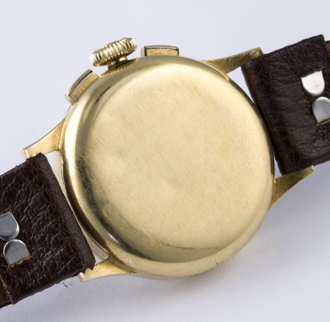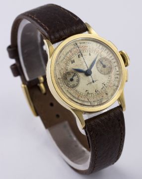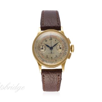 A RARE GENTLEMAN'S 18K SOLID GOLD UNIVERSAL CHRONOGRAPH WRIST WATCH CIRCA 1930s, REF. 5020 D: Silver dial with black Breguet numerals, outer minute track, mileage & base scales, double register recording minutes & continuous seconds. M: Manual wind movement, signed Jaeger, calibre 281. C: Circular case signed Universal Geneve & numbered, 18k hallmarks, case diameter measures approx. 31mm. S: Leather strap. CONDITION REPORT D: Original dial in fair condition showing signs of age. M: Working at present. C: In excellent condition with some surface scratches due to general use. S: New. D: Dial / M: Movement / C: Case / S: Strap / B: Bracelet