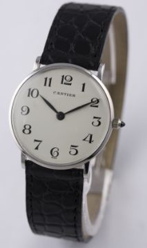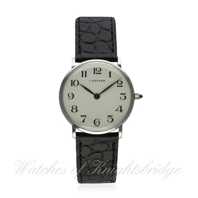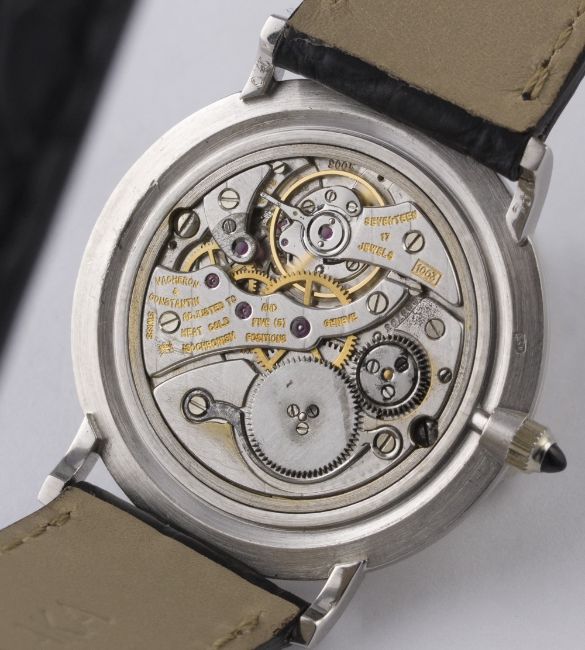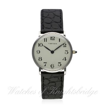 A RARE GENTLEMAN'S 18K SOLID WHITE GOLD CARTIER WRIST WATCH BY VACHERON & CONSTANTIN CIRCA 1970s, REF. 6714 D: White dial with Arabic numerals. M: 17 jewel manual wind movement, signed Vacheron & Constantin, numbered, calibre 1003. C: Circular case signed Vacheron & Constantin, hallmarked & numbered, Cartier numbers behind the lugs, case diameter measures approx. 30mm. S: Black leather strap with original 18k solid white gold Cartier deployment clasp. CONDITION REPORT D: Dial in excellent condition. M: Working at present. C: In excellent condition. S: In excellent condition. D: Dial / M: Movement / C: Case / S: Strap / B: Bracelet