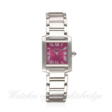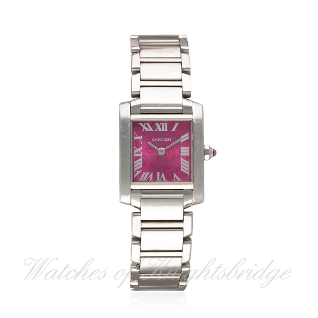 A LADIES STAINLESS STEEL CARTIER TANK FRANCAISE BRACELET WATCH CIRCA 2005, REF. 2384 D: Pink Cartier monogram dial with Roman numerals, secret signature at X. M: Quartz movement signed Cartier. C: Square Tank case, signed Cartier & numbered, original pink sapphire crown, case width measures approx. 21mm. B: Original Cartier bracelet. CONDITION REPORT D: Original dial in excellent condition. M: Working at present. C: In very good condition. B: In very good condition. D: Dial / M: Movement / C: Case / S: Strap / B: Bracelet