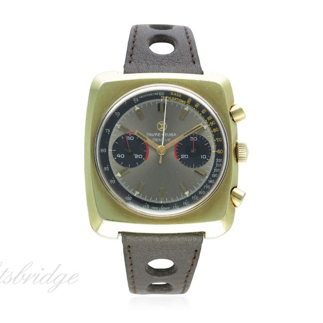 A GENTLEMAN'S GOLD FILLED FAVRE LEUBA CHRONOGRAPH WRIST WATCH CIRCA 1970s D: Grey dial with gilt batons & hands, outer tachymetre scale, two black registers recording minutes & continuous seconds. M: 17 jewel manual wind movement, signed Favre Leuba, Valjoux calibre 23. C: Large cushion shaped case, stainless steel back, signed Favre Leuba & numbered, original crown & pushers, case width measures approx. 38mm. S: Brown leather strap. CONDITION REPORT D: Original dial in very good condition showing some small signs of age. M: Working at present. C: In good condition, with some light scratches & wear due to general use. S: In excellent condition. D: Dial / M: Movement / C: Case / S: Strap / B: Bracelet.