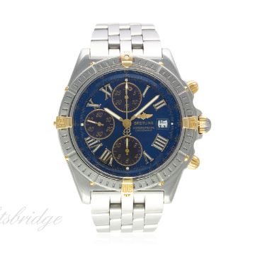 A GENTLEMAN'S STEEL & GOLD BREITLING CROSSWIND AUTOMATIC CHRONOGRAPH BRACELET WATCH DATED 2000, REF. B13355 WITH BOX & PAPERS D: Blue dial with luminous inlaid gilt Roman numerals, triple register recording hours, minutes & continuous seconds, date aperture, inner tachymetre bezel. M: Automatic chronometer movement signed Breitling & numbered. C: Circular case with rotating 60 minute bezel, signed Breitling & numbered, original crown & pushers, case diameter measures approx. 42mm. B: Original Breitling bracelet. CONDITION REPORT D: Original dial in very good condition, small mark on the dial within the minutes register. M: Working at present. C: In very good condition with some light scratches due to general use, small scuff on the edge of the bezel. B: In very good condition. D: Dial / M: Movement / C: Case / S: Strap / B: Bracelet.