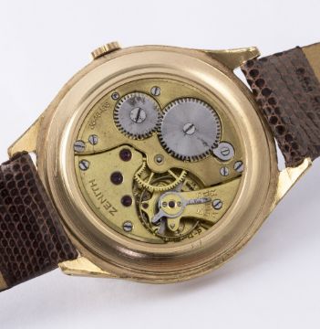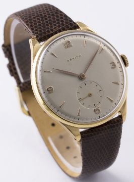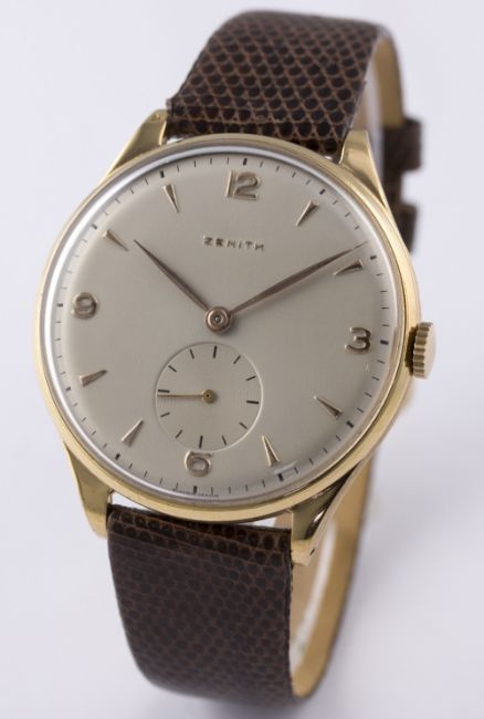 A GENTLEMAN'S LARGE SIZE GOLD PLATED ZENITH WRIST WATCH CIRCA 1950s D: Silver dial with gilt Arabic numerals & batons, subsidiary seconds. M: Manual wind movement signed Zenith & numbered, calibre 12-4-P. C: Circular case, signed Zenith, case diameter measures approx. 38mm. S: Brown leather strap. CONDITION REPORT D: Dial in excellent condition. M: Working at present. C: In excellent condition, import mark on top left lug. S: In excellent condition. D: Dial / M: Movement / C: Case / S: Strap / B: Bracelet