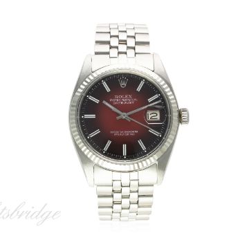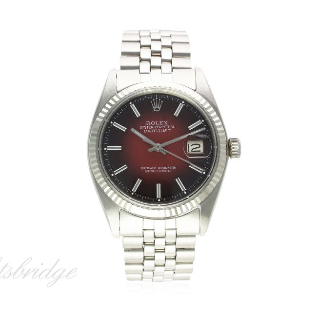A GENTLEMAN'S STEEL & WHITE GOLD ROLEX OYSTER PERPETUAL DATEJUST WRIST WATCH CIRCA 1970, REF. 1601 D: Red "smoke" dial with white inlaid silver batons, date aperture. M: 26 jewel automatic chronometer movement, signed Montres Rolex S.A., calibre 1570. C: Oyster case with solid white gold fluted bezel, signed Montres Rolex S.A., dated III.70, numbered, Rolex crown, case diameter measures approx. 36mm B: Rolex Jubilee bracelet, numbered 62510H/55. CONDITION REPORT D: Dial in excellent condition. M: Working at present. C: In excellent condition. B: In excellent condition. D: Dial / M: Movement / C: Case / S: Strap / B: Bracelet