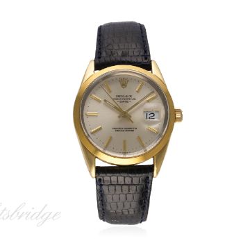 A GENTLEMAN'S STEEL & GOLD CAPPED ROLEX OYSTER PERPETUAL DATE WRIST WATCH CIRCA 1985, REF. 15505 WITH ROLEX BOX & SERVICE GUARANTEE FROM 2005 D: Silver dial with gilt batons & hands, date aperture. M: 27 jewel automatic chronometer movement with quick set date, signed Rolex S.A. & numbered, calibre 3035. C: Oyster case with "smooth" bezel, signed Montres Rolex S.A. & numbered, Rolex crown, case diameter measures approx. 34mm. S: Leather strap. CONDITION REPORT D: Original dial in excellent condition. M: Working at present. C: In very good condition. S: New. D: Dial / M: Movement / C: Case / S: Strap / B: Bracelet