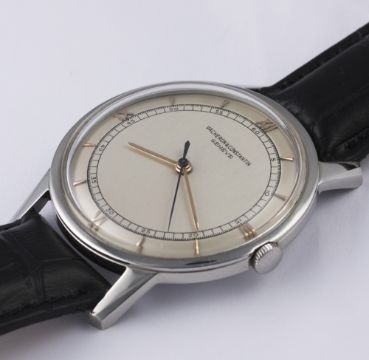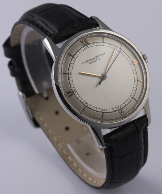 A RARE GENTLEMAN'S LARGE SIZE STAINLESS STEEL VACHERON & CONSTANTIN WRIST WATCH CIRCA 1950s, REF. 6561 D: Silver dial with gilt batons & Roman numerals, black inner seconds track. M: 17 jewel manual wind movement signed Vacheron & Constantin, numbered, calibre V454. C: Circular case, signed Vacheron & Constantin, numbered, case diameter measures approx. 37mm. S: Leather strap. CONDITION REPORT D: Dial in excellent condition. M: Working at present. C: In excellent condition. S: In excellent condition. D: Dial / M: Movement / C: Case / S: Strap / B: Bracelet