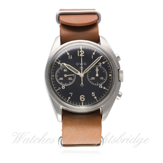 A GENTLEMAN'S STAINLESS STEEL BRITISH MILITARY CWC CHRONOGRAPH RAF PILOTS WRIST WATCH DATED 1975 D: Black dial with Arabic numerals & tritium luminous markers, military arrow, double register recording minutes & continuous seconds. M: 17 jewel manual wind movement, Valjoux calibre 7733. C: Asymmetric military case with fixed bars, signed CWC, issue markings 0552-924-3306 ^ 4895/75, case diameter measures approx. 39mm. S: Leather NATO style strap. CONDITION REPORT D: Original dial in excellent condition, showing some small signs of age. M: Working at present. C: In very good condition, with some scratches due to use. S: New. D: Dial / M: Movement / C: Case / S: Strap / B: Bracelet